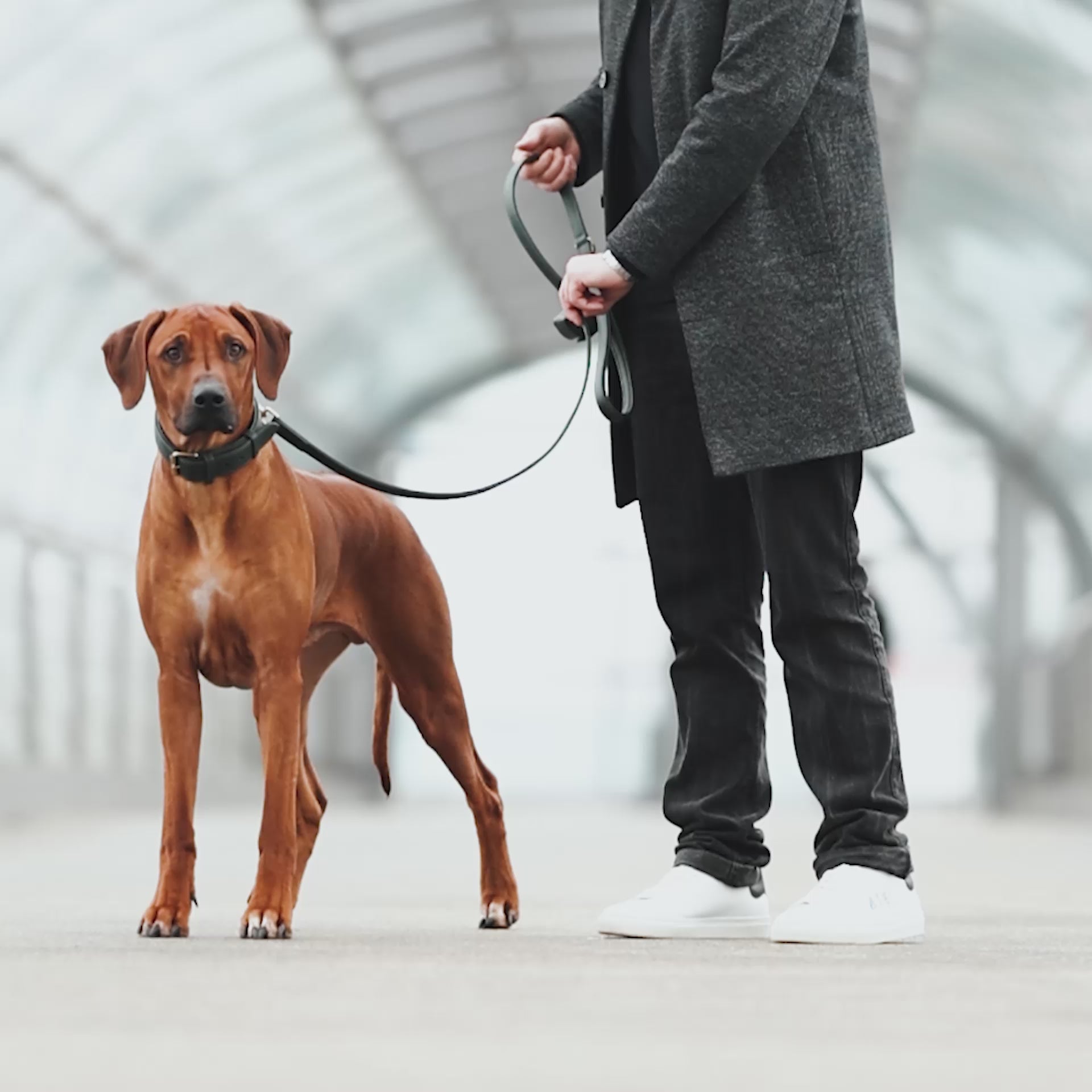Guinzaglio di alta qualità in pelle Dark Moss di colore verde scuro - robusto, durevole e facile da pulire. Ideale per cani di piccola e grande taglia, offre il massimo comfort e un design elegante senza compromessi.