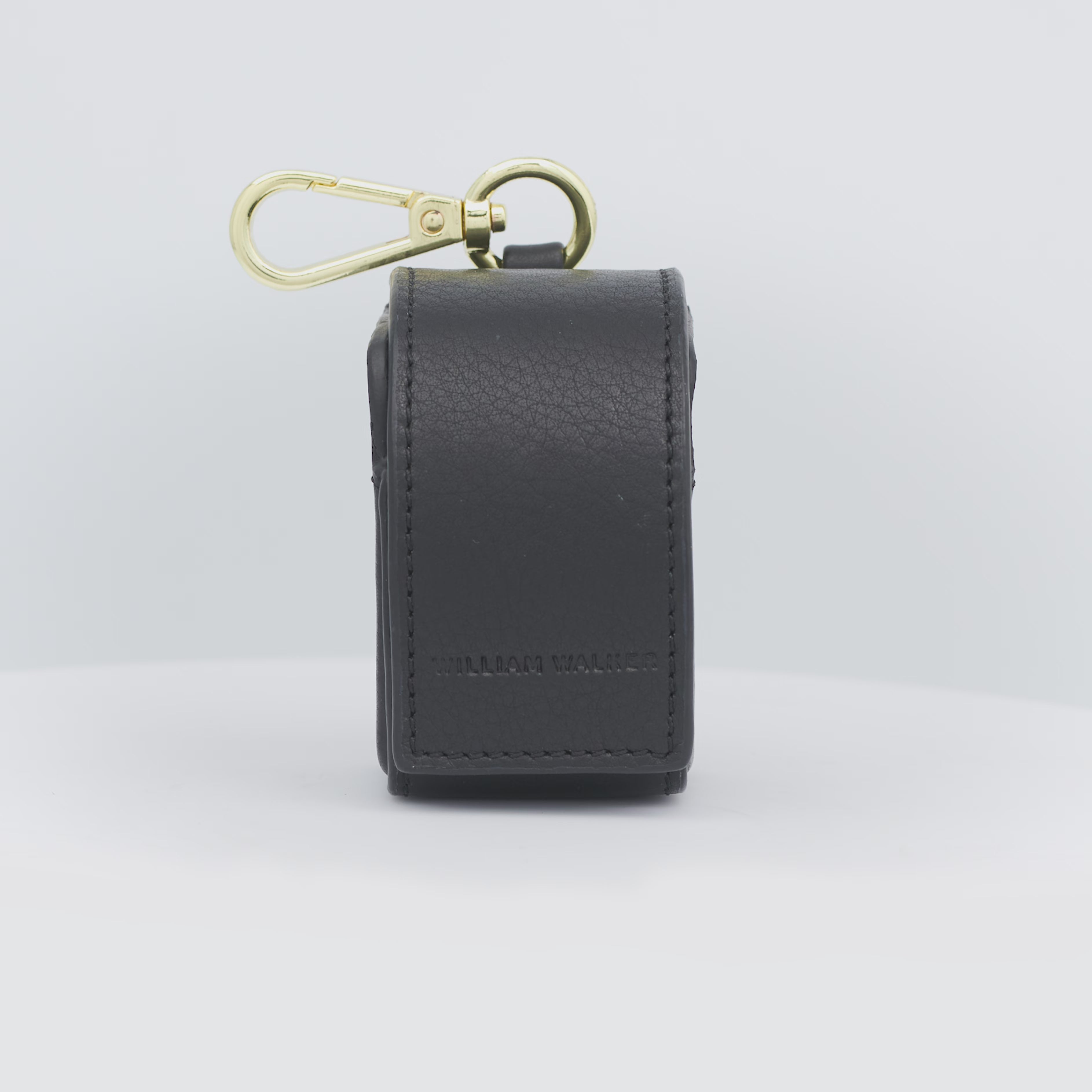 Distributore di sacchetti per la cacca di alta qualità in pelle nera con apertura a scomparsa sul retro. Facile da agganciare grazie al moschettone.