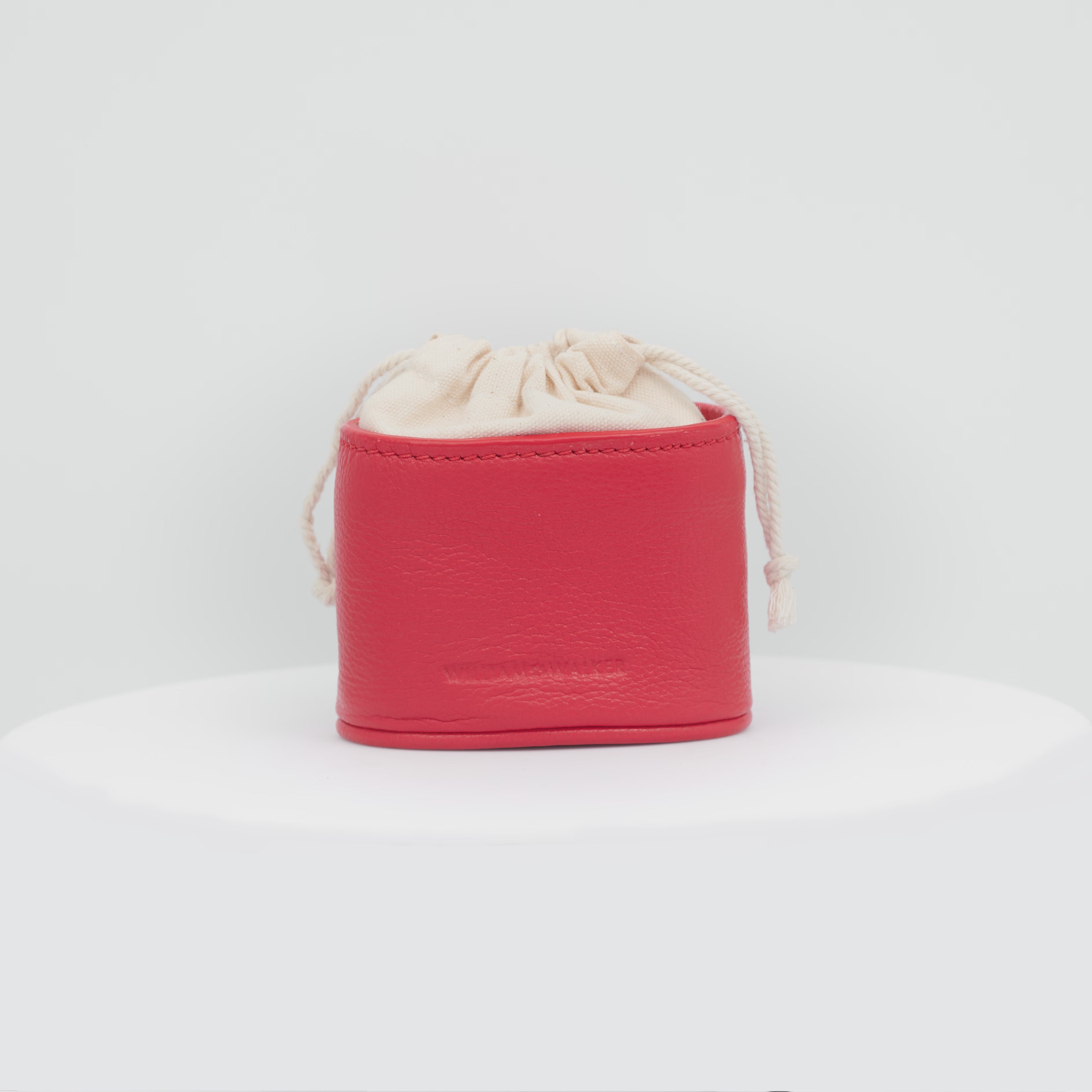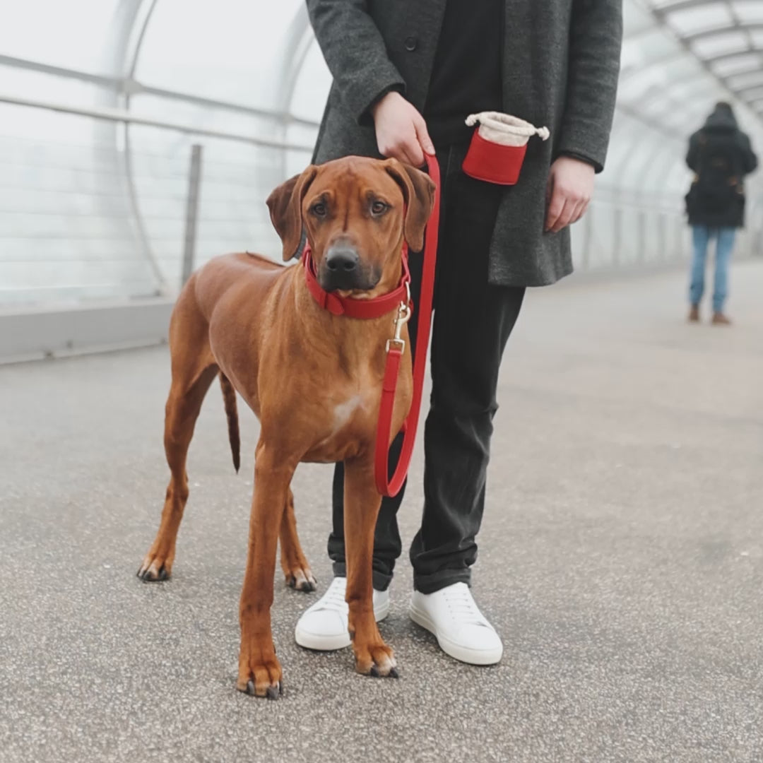 Borsa per dolcetti di alta qualità in pelle rossa con pratiche opzioni di aggancio per un addestramento elegante del cane.