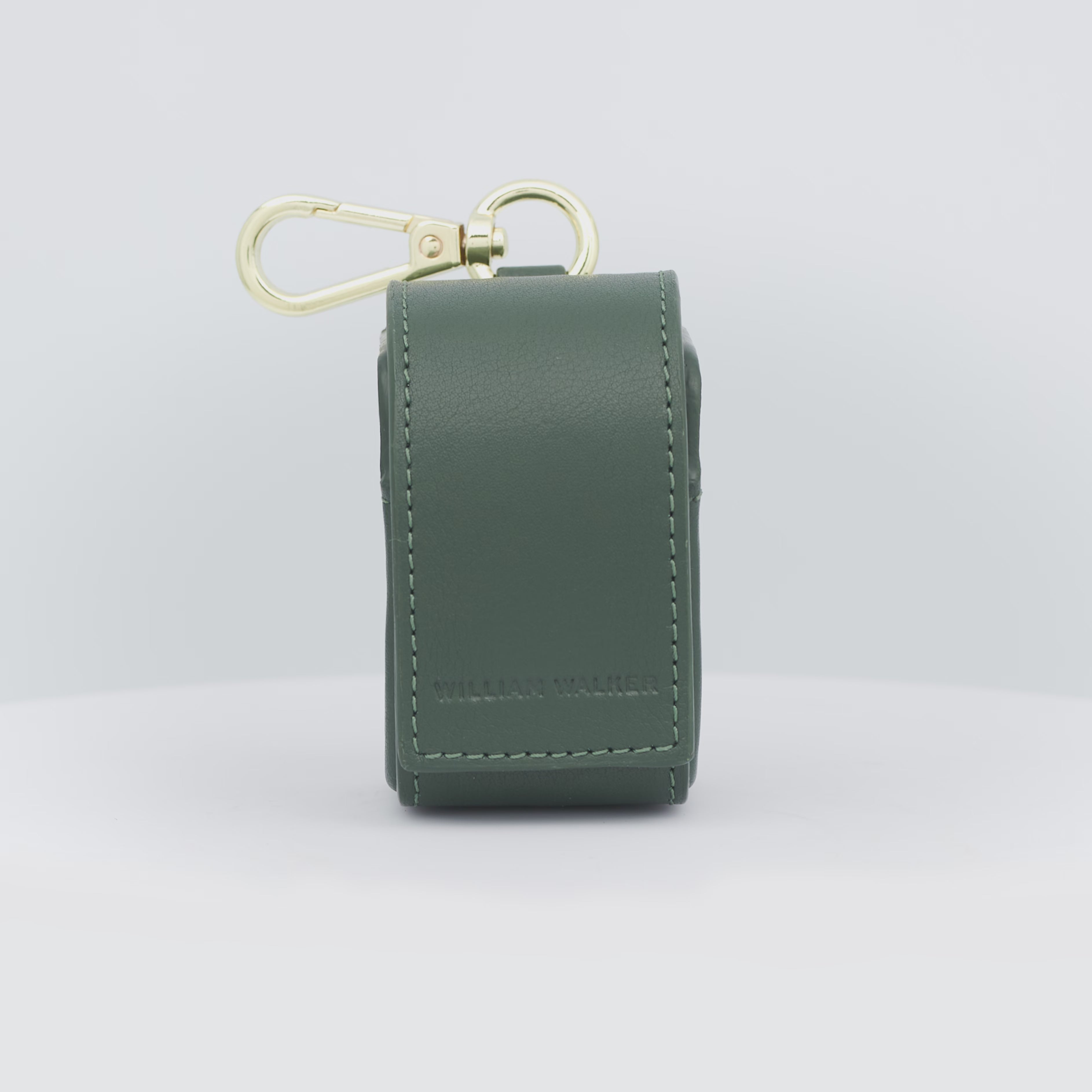 High-quality poop bag dispenser made of dark green leather with a pull-out opening on the back. Easy to attach thanks to the carabiner.
