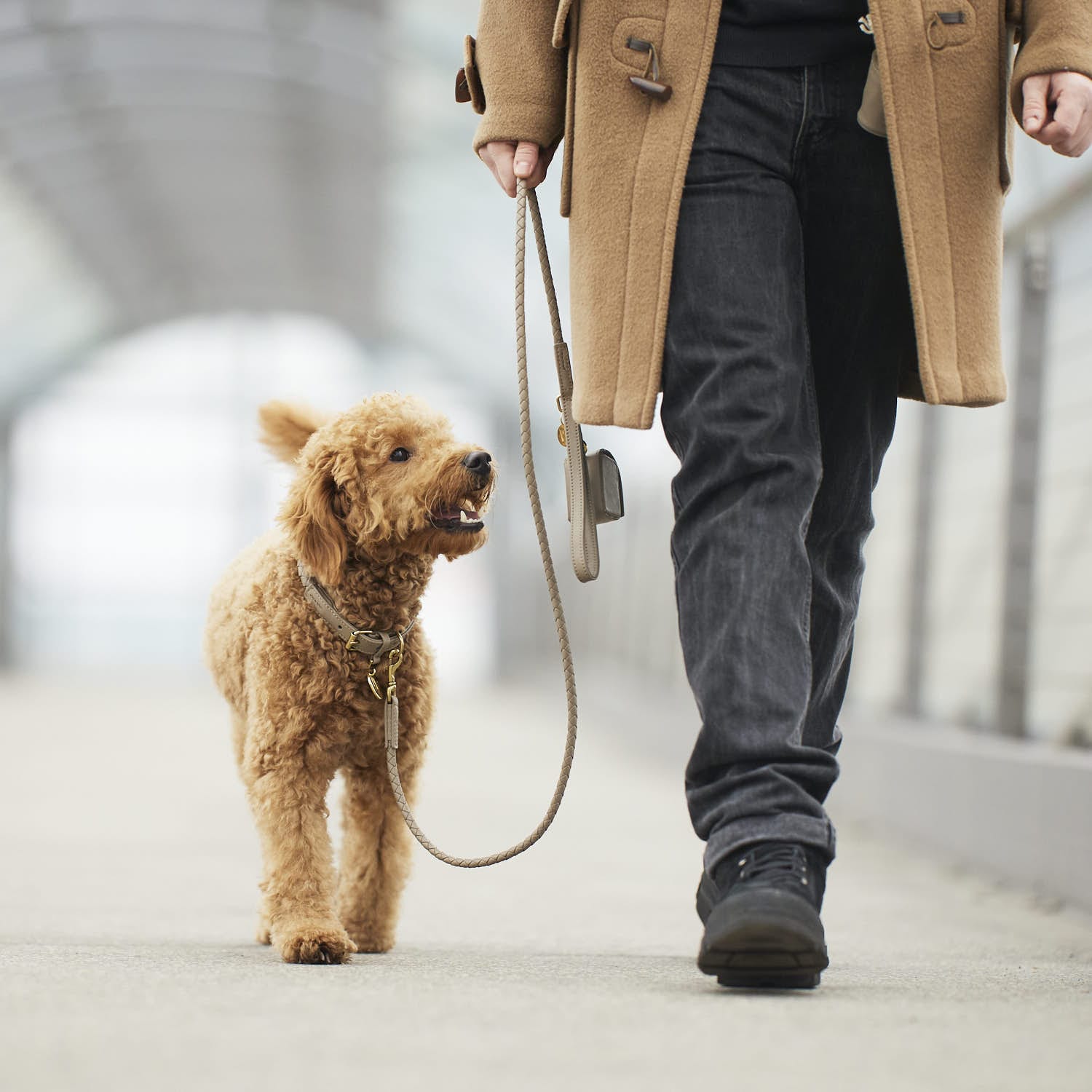 High-quality treat bag made of beige leather with practical attachment options for stylish dog training.